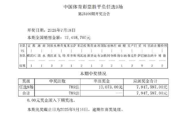 北京时间7月18日,胜负彩第25100期任九开奖结果揭晓。本期任九开出789注,单注奖金10,073元,本期任九投注总额为12,418,700元。