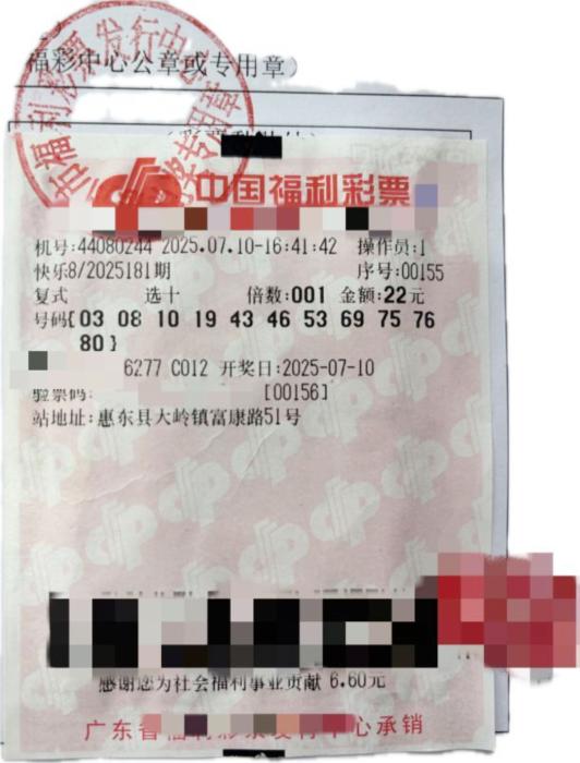 2025年7月10日,中国福利彩票快乐8游戏第2025181期开奖,当期全国共中出一等奖3注,其中1注花落惠州市惠东县大岭镇富康路福彩销售站点,中奖彩票为一张22元“十一选十”复式票,中奖奖金为508万元。