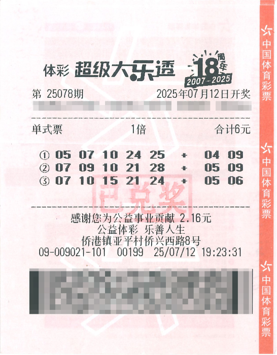 7月12日,体彩超级大乐透第25078期开奖,前区开出号码07、10、15、21、24;后区开出号码05、06。本期全国销售3.22亿元,为国家筹集彩票公益金1.15亿元。全国共中出5注一等奖,单注奖金1000万元,其中1注一等奖花落广西北海市。