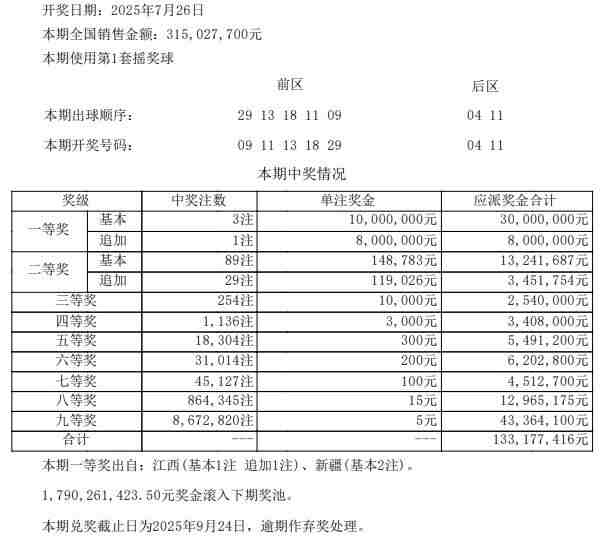 北京时间7月26日晚,体彩大乐透第25084期开奖,当期开奖号码为前区09 11 13 18 29,后区04 11。