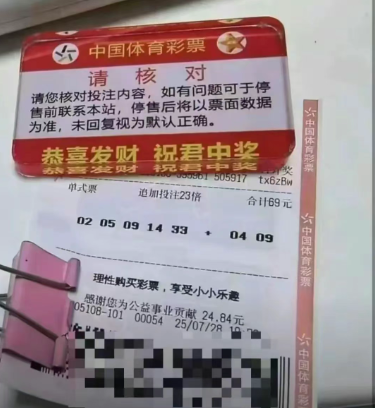 这张创造奇迹的彩票实票曝光,显示出中奖的过程仅源于简单的“单注号码23倍追加”操作。票面清晰可见,投注号码旁的“追加”字样格外醒目。谁能想到,这张仅花费69元的彩票,竟精准命中所有开奖号码,包揽了全国23注追加头奖。熟悉彩票的人都知道,超级亿元巨奖往往源于单式投注,与成本较高的复式投注相比,“单挑一注 + 高倍追加”方式更需要运气和胆识。一位老彩友感叹道:“看似简单的操作,背后却藏着无数人梦寐以求的好运,69元换来一座金山。”