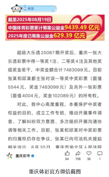 对此,我中心高度重视,本着保护中奖者权益的目的,成立工作专班,推动开展事件调查、了解纠纷双方意愿、多次组织开展沟通协调等相关工作。目前,张某和邱某对中奖彩票的归属权仍存在争议,张某已向司法机关提起相关诉讼。8月20日,重庆市渝北区人民法院出具了民事裁定书(﹝2025﹞渝0112民初53389号),裁定冻结涉事彩票奖金,目前中奖彩票的兑奖流程暂时中止,中奖彩票暂由我中心保管。待司法机关作出相应判决或裁定后,我中心将依法为合法权利人办理兑奖手续。请相关各方以事实为依据、以法律为准绳,配合调查,通过合法渠道表达诉求、解决纷争。
