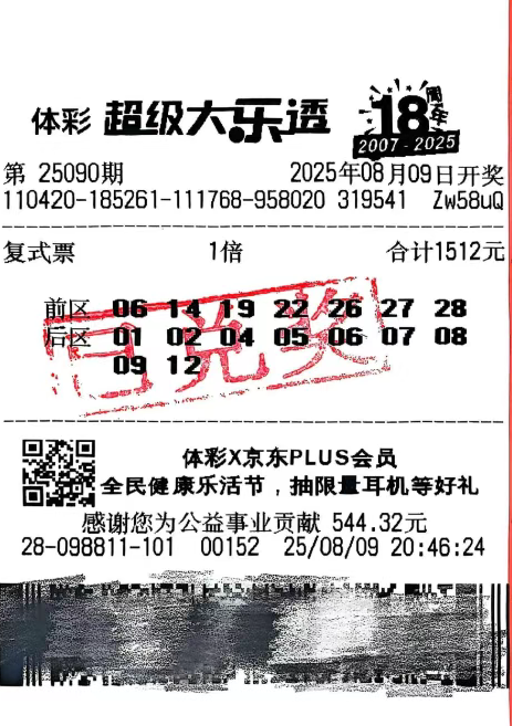 8月9日,超级大乐透第25090期开奖,前区开出号码06、14、19、22、27,后区开出01、04。全国共中出7注一等奖,每注奖金为964万余元。湖北恩施的98811体彩门店幸运彩民中得当期一等奖,总奖金达到1078万元。