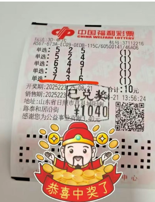 8月21日,王先生(化名)在路过小区的彩票店时,随机选择了5注3D游戏号码,没想到幸运降临,他中得了3D单选奖,奖金1040元。当接到中奖通知时,王先生惊讶地问:“真的吗?我竟然能中奖?我都是随机选的!”
