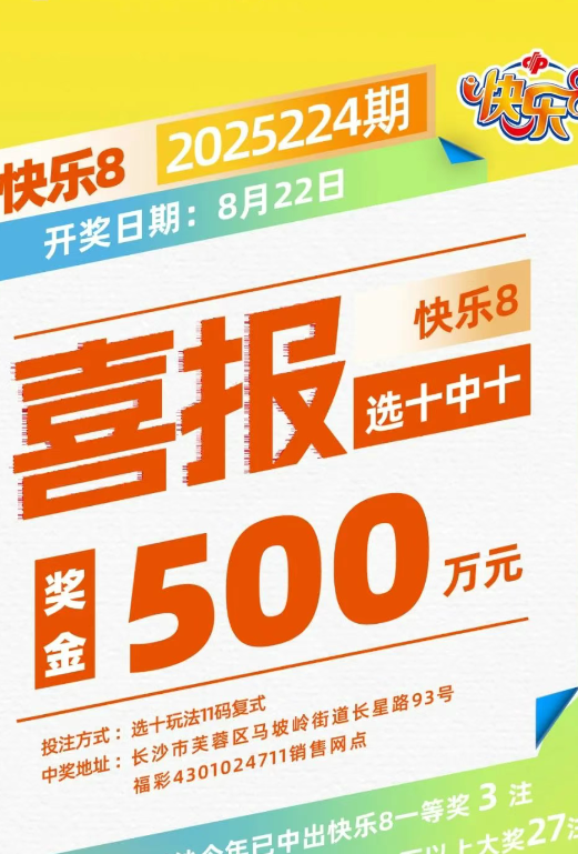 8月22日,中国福利彩票‘快乐8’游戏第2025224期开奖,长沙一位彩民幸运中得‘快乐8’一等奖1注,奖金高达500万余元。此次中奖发生在长沙市芙蓉区马坡岭街道长星路93号的福彩销售网点(4301024711),该彩民采用“选十玩法”复式投注。根据统计,今年长沙福彩已累计中出‘快乐8’一等奖3注,共有27注大奖突破500万元。