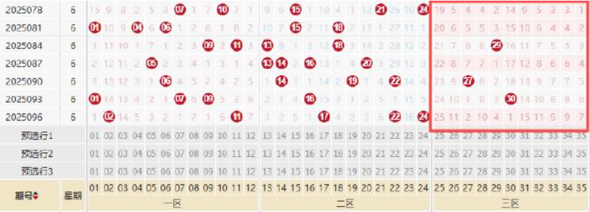更有意思的是,在三区空开的数据中,17次空开有10次出现在周六,而且以近期更为明显。在最近7个周六开出的奖号中,有高达4期出现了三区空开的现象。巧合的是,024期-042期的7个周六奖号中,同样有4期三区奖号空开,可见这一现象在周六扎堆并不仅仅是猜想。