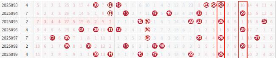 小编还发现红球有两码在近期实现了交替开出的神奇现象。自双色球25093期开始,连续7期红球26和29仿佛商量好了一般,默契地交替开出。按此规律,25099期刚刚开出红球26,那么在周日的第25100期开奖中,我们或许可以直接选择红球29,并将26大胆杀号。此外值得一提的是,双色球红球奇偶比已经连续4期开出4:2,而上一次连续4期开出相同奇偶比还要追溯到去年。那么下期奇偶比能否延续4:2的趋势呢,让我们拭目以待!