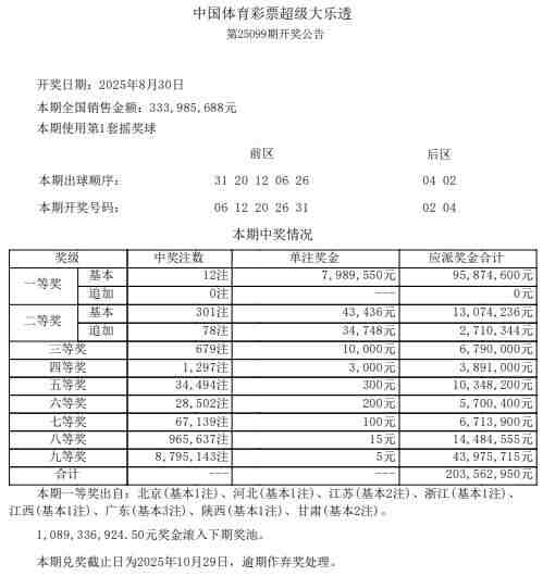 北京时间8月30日晚,体彩大乐透第25099期开奖,当期开奖号码为06 12 20 26 31 + 02 04。