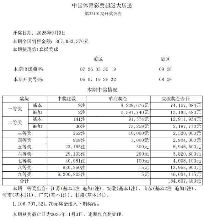 本期全国销量为3.07亿元,奖池方面,11.06亿余元滚存至9月6日(周六)开奖的第25102期。