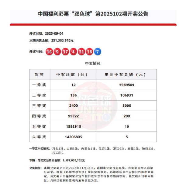 2025年9月4日,福彩双色球第25102期开奖详情: