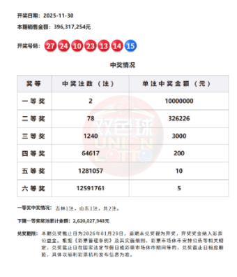 22:08 本期一等奖开出2注,单注奖金1000万元分落2地,吉林和山东各1注。二等奖开出78注,单注奖金32.6万余元。本期双色球全国销量为3.96亿余元,计奖结束后奖池余额为26.2亿余元。