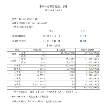 北京时间12月8日晚,体彩大乐透第25140期开奖,当期开奖号码为前区04 05 13 18 34,后区02 08。