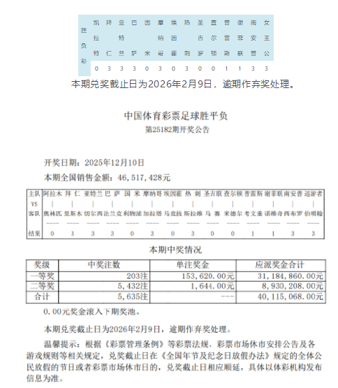 北京时间12月10日,胜负彩第25182期开奖结果揭晓。本期足彩头奖开出203注,单注奖金153,620元,1034万滚存被清空;二等奖开出5432注1644元;任九开21,578注639元。本期胜负彩销量为46,517,428元,任九投注总额为21,545,870元。