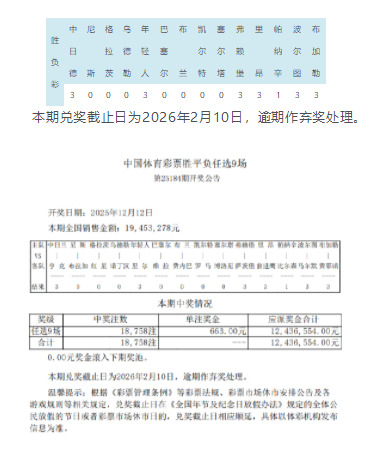北京时间12月12日,胜负彩第25184期任九开奖结果揭晓。本期任九共开出18,758注,单注奖金663元。本期任九投注总额为19,453,278元。