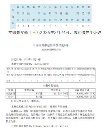 北京时间12月19日,胜负彩第25189期开奖结果揭晓。本期任九开出857注,单注奖金11,210元,本期任九的投注总额为15,010,990元。