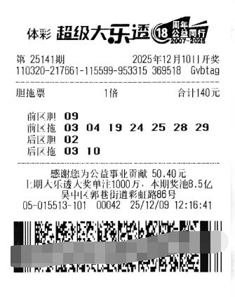在体彩大乐透第25141期,来自苏州3205015513网点的购彩者王先生凭借一张胆拖投注票,收获了基本投注一等奖,奖金总计994万元!