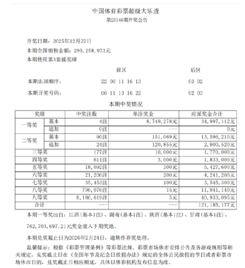 本期全国销量为2.95亿元,奖池方面,7.62亿余元滚存至12月24日(周三)开奖的第25147期。
