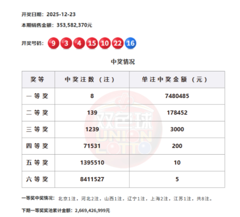 22:10 本期一等奖开出8注,单注奖金748万余元,8注头奖分落6地,其中河北、上海各2注,北京、山西、辽宁、江苏各1注。二等奖开出139注,单注奖金17万余元。本期双色球全国销量为3.53亿余元,计奖结束后奖池余额为26.69亿余元。
