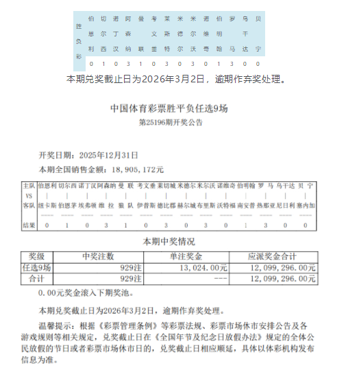 北京时间12月31日,胜负彩第25196期任九开奖结果揭晓。本期任九开出929注,单注奖金13,024元。本期任九投注总额为18,905,172元。
