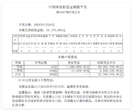 北京时间1月26日,足彩第26017期开奖结果揭晓。本期14场1等开出15注,单注奖金128万元,此前654万滚存被清空;14场2等开出494注,单注奖金11029元;任九开出2180注,单注奖金6141元。本期14场销量为28,379,060元,任九总投注额为20,918,212元。