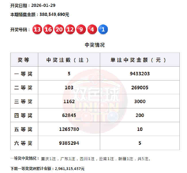 北京时间2026年1月29日,福彩双色球第26013期开奖,当期开奖号码为红球04 09 12 13 16 20,蓝球01。需要注意的是,根据福彩官方发布公告,双色球将于2026014期(2026年2月1日开奖)开始,变更游戏规则,新增福运奖,且一、二等奖增设封顶额!