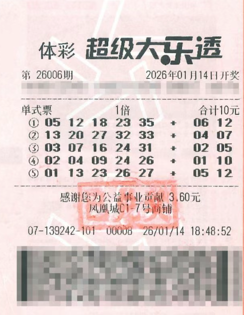 在1月14日,超级大乐透第26006期开奖,前区号码为05、12、18、23、35,后区则是06、12。本期全国销售额达到3.15亿元,为国家筹集了1.13亿元的彩票公益金。广西贵港传来喜讯,一位购彩者通过一张10元5注的单式票,成功揽获1注一等奖。中奖者吴女士(化姓)已于1月30日下午前往广西体彩中心办理兑奖手续。吴女士购买彩票已有五六年时间,最喜欢购买超级大乐透,偶尔也会尝试排列3。她表示自己选号完全“靠运气”,通常选择机选单式,每次投入不超过20元。“我从来没有研究过号码,也没有守号,纯粹是碰碰运气。”她笑着说道。