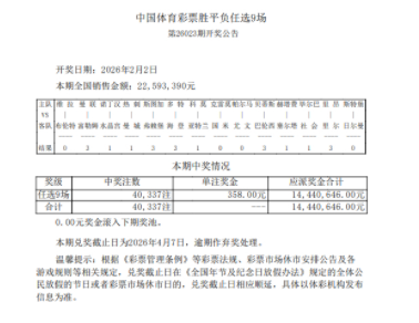 北京时间2月2日,足彩第26023期任九开奖结果继续。本期任九开出40,337注,单注奖金358元。本期任九投注总额为22,593,390元。