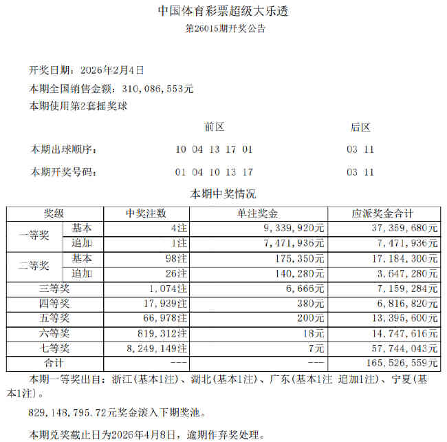 北京时间2月4日晚,体彩大乐透第26015期开奖,当期开奖号码为前区01 04 10 13 17,后区03 11。本期是大乐透规则变更后的第二期,原九等奖级变更为现七等奖级,具体详情点击查看:中国体育彩票超级大乐透游戏规则