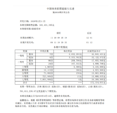 北京时间2月11日晚,体彩大乐透第26018期开奖,当期开奖号码为前区09 11 19 30 35,后区01 12。本期是大乐透规则变更后的第五期,原九等奖级变更为现七等奖级,具体详情点击查看: