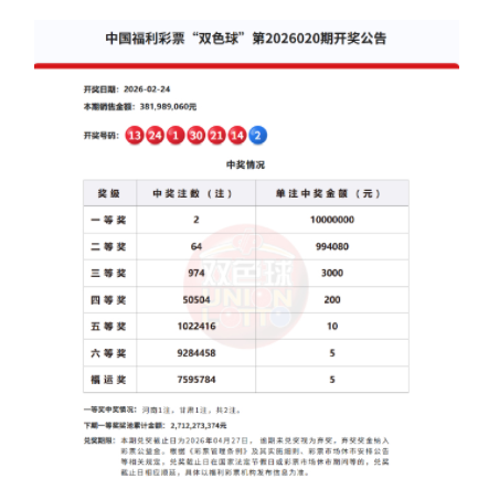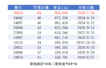 北京时间2026年2月24日,福彩双色球第26020期开奖,当期开奖号码为红球01 13 14 21 24 30,蓝球02。本期一等奖仅开出2注,单注奖金1000万元。值得注意的是,本期二等单注奖金99.4万,排名近10年二等奖奖金第1位!TOP10排名如下: