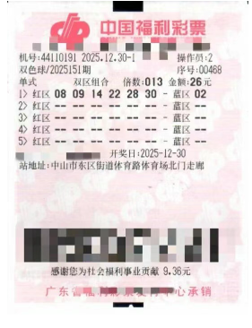 2025年12月30日,中国福利彩票“双色球”第2025151期开奖,全国共中出125注二等奖,其中13注落在中山市东区街道体育路44110191福彩销售站点。幸运的彩票是一张26元投注、13倍倍投的单注号码,最终收获二等奖13注,总奖金超过213万元。