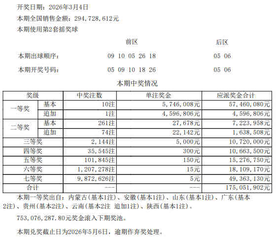 北京时间3月4日晚,体彩大乐透第26022期开奖,当期开奖号码为前区05 09 10 18 16,后区05 06。