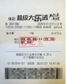 1月31日开奖的超级大乐透"]第26013期,全国共开出10注一等奖。其中,来自沈阳辽中的赵先生凭借一张6+2复式票,成功中得1注一等奖以及多注小奖,单票奖金合计达到616.4万元(含税)。