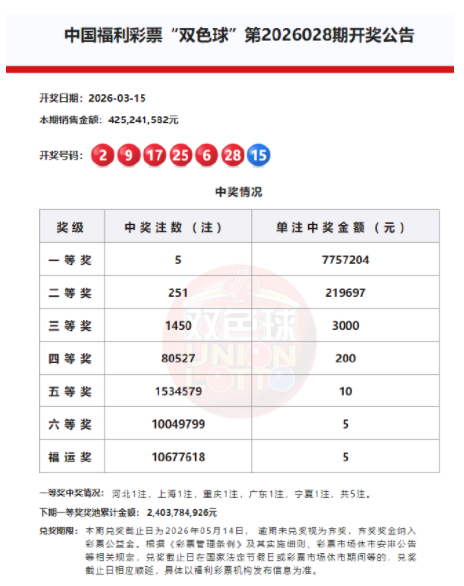 北京时间2026年3月15日,福彩双色球第26028期开奖,当期开奖号码为红球02 06 09 17 25 28,蓝球15。本期一等奖开出5注,单注奖金775万元;二等奖开251注,单注奖金21.9万。此外,因开奖前奖池高于15亿,增设5元福运奖(命中3枚红球即中奖),共开出10677618注。本期双色球销量为4.25亿余元,奖池余额24.03亿余元。