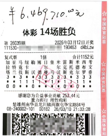 近日,第26039期“体彩14场胜负”开奖传来喜讯,段先生(化姓)喜中一等奖,获得奖金646万元。
