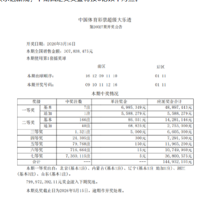 本期全国共开出7注一等奖,单注奖金698万元,其中1注选择追加,多得奖金558万元,追加头奖出自辽宁;7注基础头奖分落北京、内蒙古、辽宁、浙江、山东。二等奖开出166注,单注奖金8万余元,其中40注采用追加投注,每注多得奖金6万余元。本期全国销量为3.07亿元,开奖后奖池余额7.99亿,根据大乐透新规,下期固定奖奖金将按8亿以下对照。