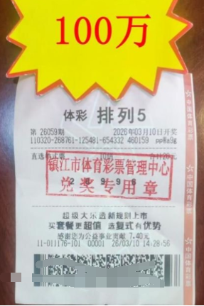 3月10日,第26059期体彩“排列5”开出了中奖号码“2、0、9、9、6”。来自镇江体彩3211011176网点的消息传来,一位幸运者精准命中本期一等奖的10注,喜获100万元奖金!