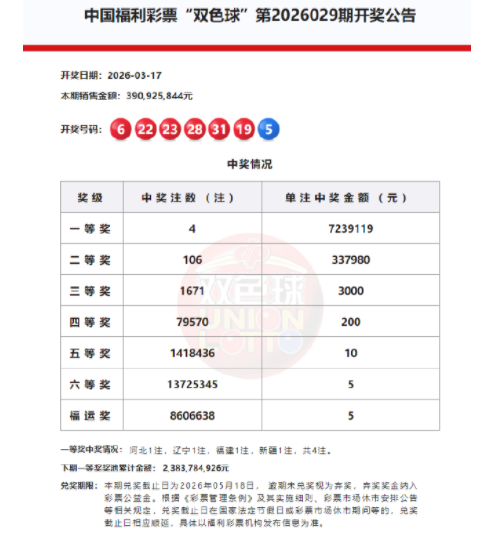 北京时间2026年3月17日,福彩双色球第26029期开奖,当期开奖号码为红球06 19 22 23 28 31,蓝球05。本期一等奖开出4注,单注奖金723万元;二等奖开106注,单注奖金33.7万。此外,因开奖前奖池高于15亿,增设5元福运奖(命中3枚红球即中奖),共开出8606638注。本期双色球销量为3.9亿余元,奖池余额23.83亿余元。