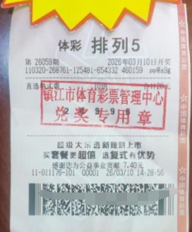 3月10日,第26059期体彩“排列5”开出了中奖号码“2、0、9、9、6”。来自镇江的体彩3211011176网点传来喜讯,一位幸运儿精准命中本期一等奖,获得了100万元的奖金!