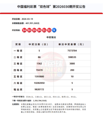 北京时间2026年3月19日,福彩双色球第26030期开奖,当期开奖号码为红球10 11 14 19 22 24,蓝球04。本期一等奖开出5注,单注奖金757万元;二等奖开86注,单注奖金59.8万。此外,因开奖前奖池高于15亿,增设5元福运奖(命中3枚红球即中奖),共开出9820172注。本期双色球销量为4.01亿余元,奖池余额23.58亿余元。