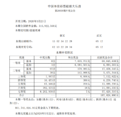 北京时间3月23日晚,体彩大乐透第26030期开奖,当期开奖号码为前区02 13 22 28 34,后区05 12。