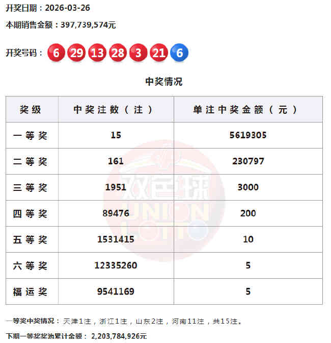 北京时间2026年3月26日,福彩双色球第26033期开奖,当期开奖号码为红球03 06 13 21 28 29,蓝球06。本期一等奖开出15注,单注奖金561万余元;二等奖开161注,单注奖金23万余元。此外,因开奖前奖池高于15亿,增设5元福运奖(命中3枚红球即中奖),共开出9541169注。本期双色球销量为3.97亿余元,奖池余额22.03亿余元。