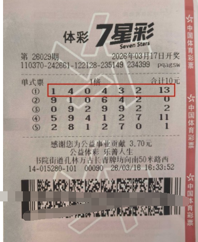 这次老宋的目的地是山东,3月16日,当他驾车经过曲阜时,决定探访三孔,开启一段文化之旅。“孔林是我游览的最后一站,出来时已经是傍晚了,我看到景区外有一家体彩投注站,就进去休息了一下,”老宋回忆道:“多年前我曾购买彩票的7星彩,那天突然兴起,随机选了5注号码。”3月17日,7星彩第26029期公布了中奖号码“1 4 0 4 3 2 + 11”,老宋惊喜地发现,他投注的第一注号码与开奖号码仅差一个后区号码,幸运中得二等奖,奖金为12.61万元。他表示:“当时只是随意买了一注彩票,没想到真的能中奖。曲阜真是一座东方圣城,为我带来了如此丰富的游玩体验,今后我一定会再回到这个福地!”