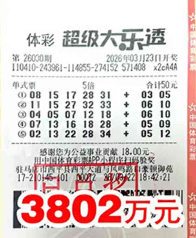 编者按:3月23日,超级大乐透第26030期开奖,河南驻马店西平县一位购彩者凭借一张5注单式5倍投的彩票,仅用50元投注,一举斩获3802万元巨奖!不久后,河南体彩官方账号发布,中奖者已火速兑奖!