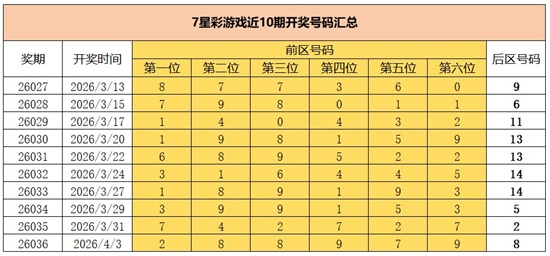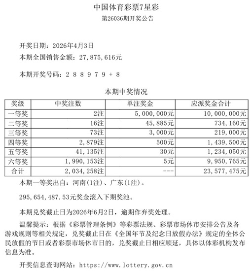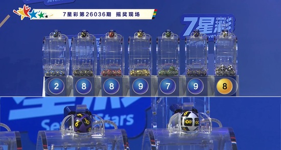 2026年4月3日晚,中国体育彩票7星彩第26036期开奖,当期开奖号码为前区“2 8 8 9 7 9 ”,后区“8”。