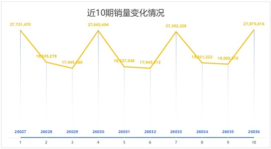 7星彩第26036期当期销量为27,875,616元。相比上一期(第26035期)销量增加8,872,644元,增幅达到46.69%。当期销量出现大幅增长,是时间节点、消费心理、开奖周期共同作用的结果。周五是工作日收尾、周末开启的节点,群众休闲意愿与消费热情显著提升,购彩自然成为衔接工作与休闲生活的轻松选择。同时,7星彩周二、周五、周日开奖,周二至周五间隔3天,购彩者的期待感得以充分积累,购彩意愿与单次购彩金额投入相应提高。加之周五社交场景丰富,购彩话题传播更广,进一步带动销量增长。