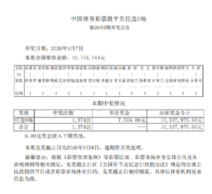 北京时间4月7日,胜负彩第26055期开奖结果揭晓。本期任选九场开出1,374注,单注奖金7,524元。本期任九投注总额为16,153,744元。