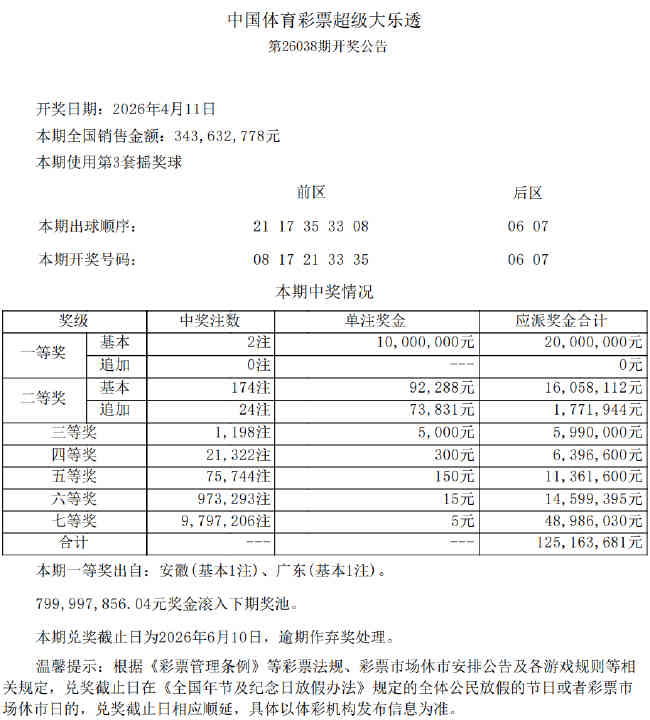 北京时间4月11日晚,体彩大乐透第26038期开奖,当期开奖号码为前区08 17 21 33 35,后区06 07。