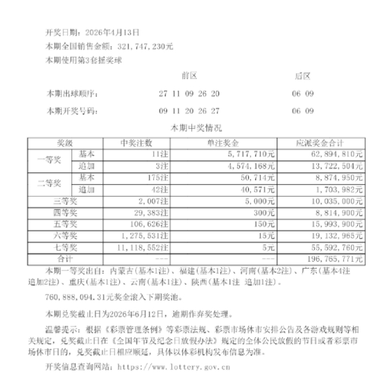 北京时间4月13日晚,体彩大乐透第26039期开奖,当期开奖号码为前区09 11 20 26 27,后区06 09。