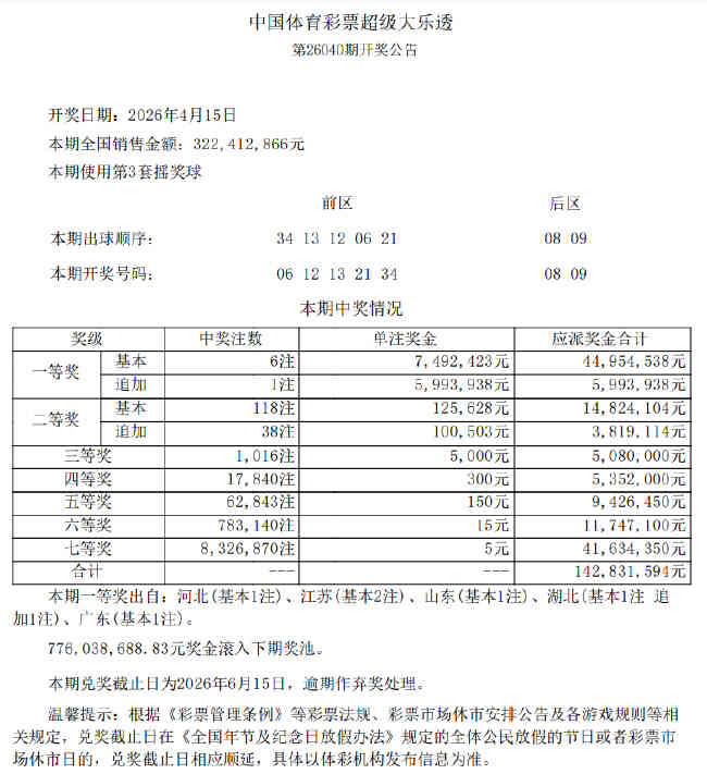 北京时间4月15日晚,体彩大乐透第26040期开奖,当期开奖号码为前区06 12 13 21 34,后区08 09。